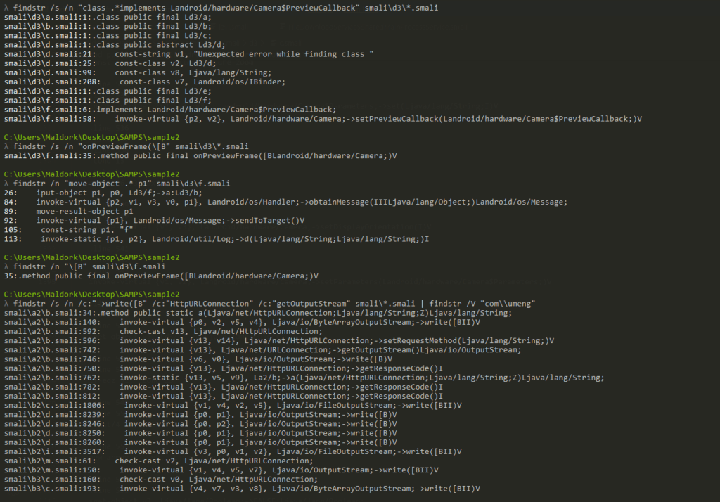 onPreviewFrametoHandler.obtainMessage()tosendToTarget()), and elsewhere raw byte arrays are written to network streams (HttpURLConnection.getOutputStream()/OutputStream.write([BII)andsetRequestMethod). By filtering out some known analytics, so this looks like custom code that captures live camera frames and uploads them to a remote server (probable exfiltration).I also did some keyword searches and was able to find some directories of intrest