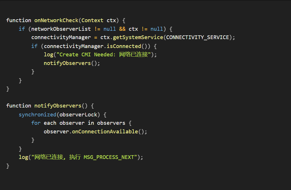 This function watches for network connectivity and, when the device is online, notifies registered observers. Those observers’ onConnectionAvailable() callbacks likely start queued actions, i.e., uploading data, sending heartbeats, or polling a C2 server. The Chinese log strings suggest the code came from a Chinese source or developer; behavior is typical of malware that delays exfiltration until a network is available.