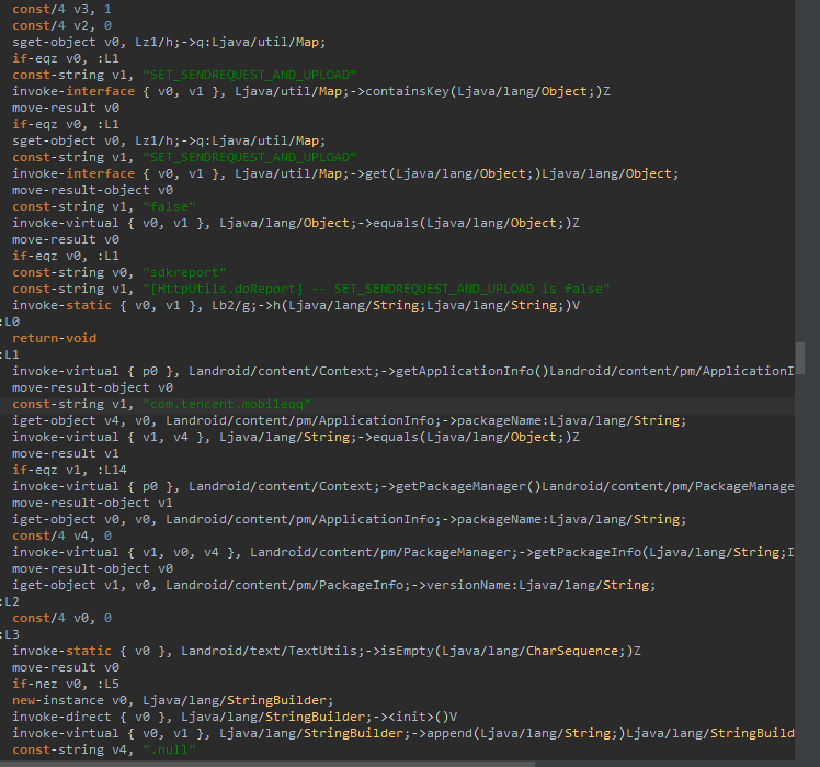 If the flag allows uploading, the code proceeds to inspect app metadata, specifically checking if the package name matches "com.tencent.mobileqq" (the QQ app) and then fetches its version info from the package manager. It also builds or logs a report string (sdkreport, HttpUtils.doReport) which strongly suggests SDK telemetry, analytics, or possible data exfil/reporting behavior. In short: it’s a conditional upload/report function that checks configuration, verifies QQ’s presence, and then prepares a network report or telemetry payload.