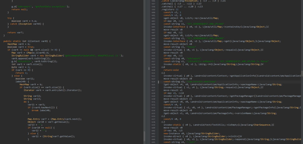 - Right side: Smali code, aka low-level Dalvik bytecode.